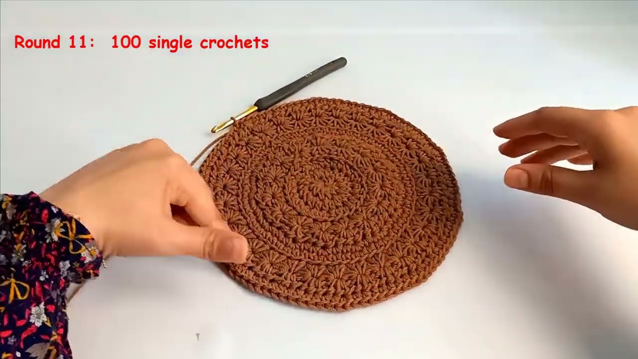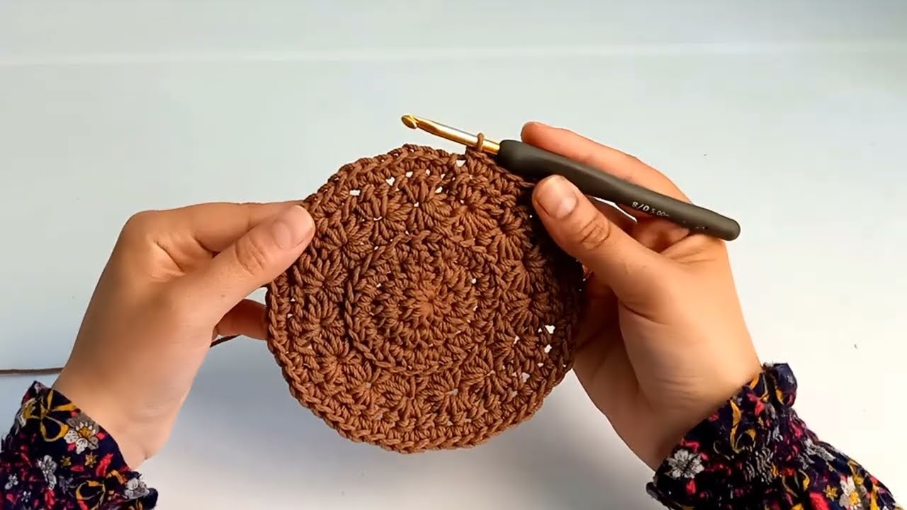 Continue increasing rounds until the base reaches your desired diameter (usually 20–25 cm for a medium bag).